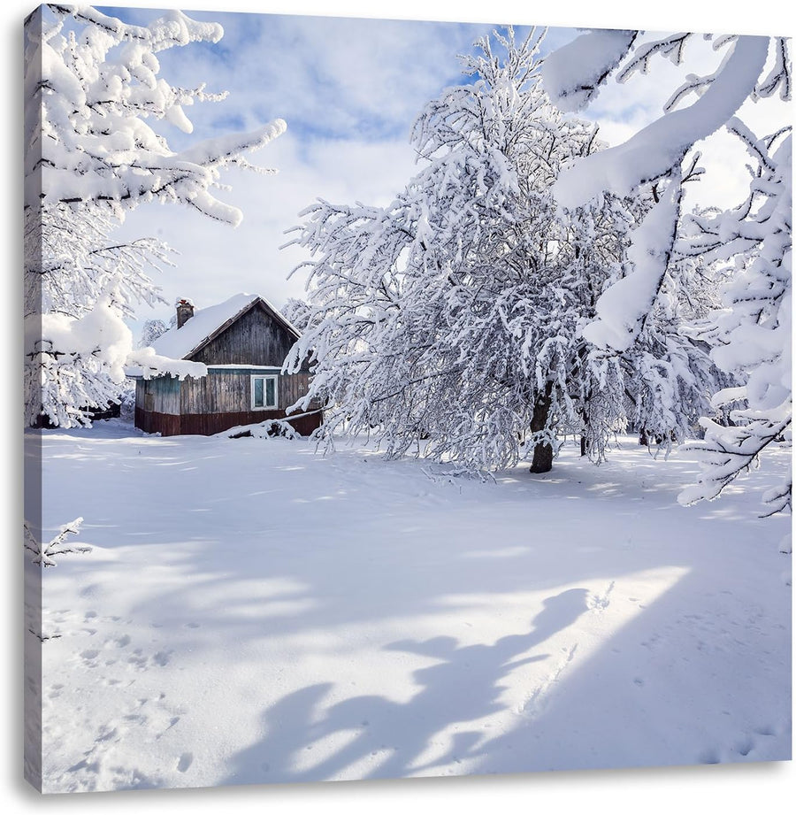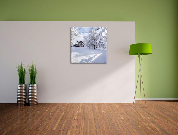 Winterlandschaft mit Hütte, Format: 70x70 auf Leinwand, XXL riesige Bilder fertig gerahmt mit Keilra