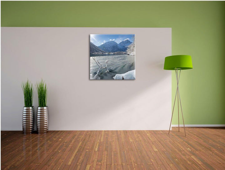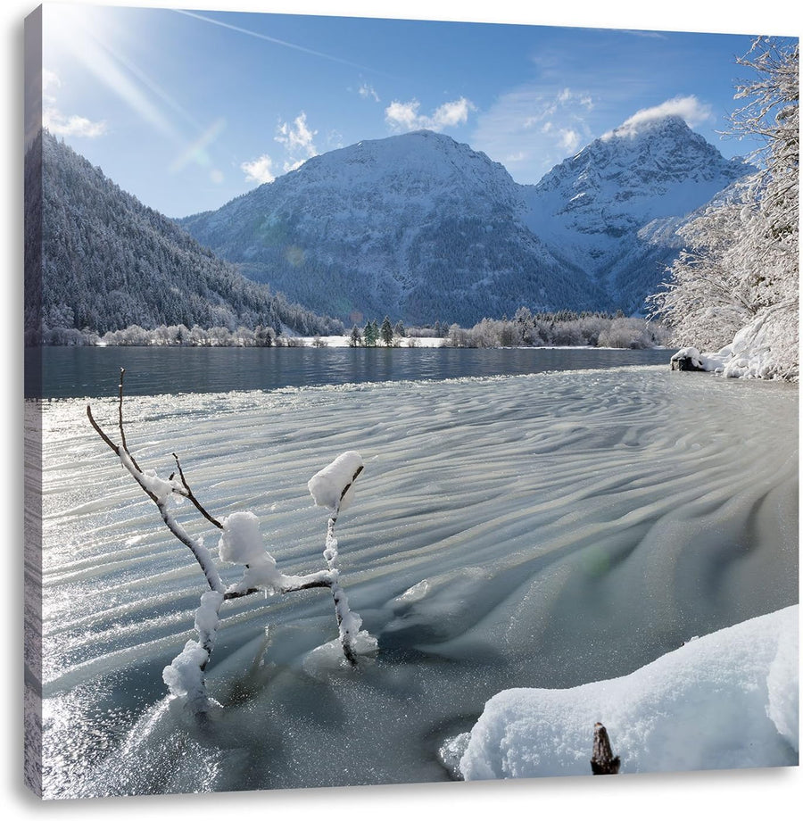 Winterlandschaft See, Format: 70x70 auf Leinwand, XXL riesige Bilder fertig gerahmt mit Keilrahmen,