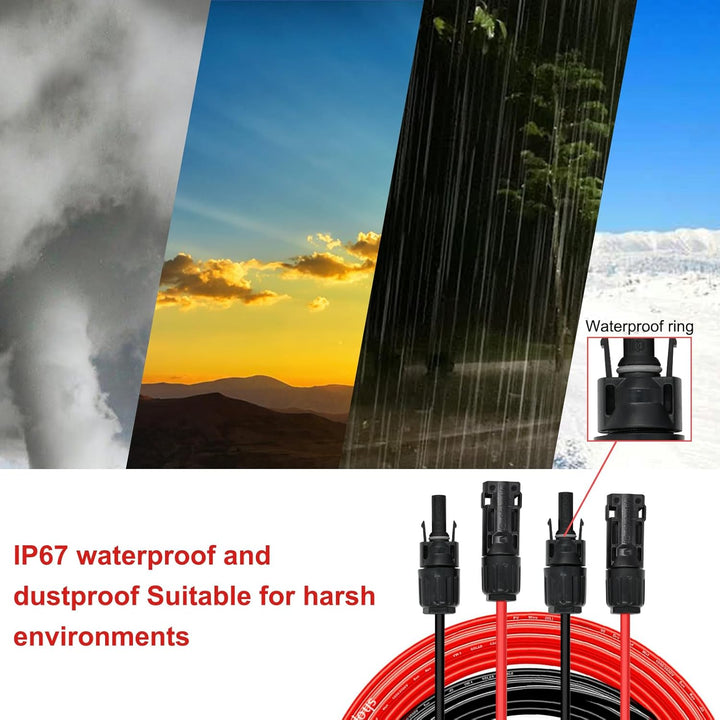- Zwei (1 rot + 1 schwarz) 12 m ,10 AWG (6 mm²) Solar-Verlängerungskabel bestehen aus verzinntem 1500-V-Kupfer-Solarkabel mit 70A 1,5-kV-IP68-PV-Steckverbindern aus hartem PPO-Kunststoff (70 A, 1,5 kV), Buchse und Stecker an jedem Ende.