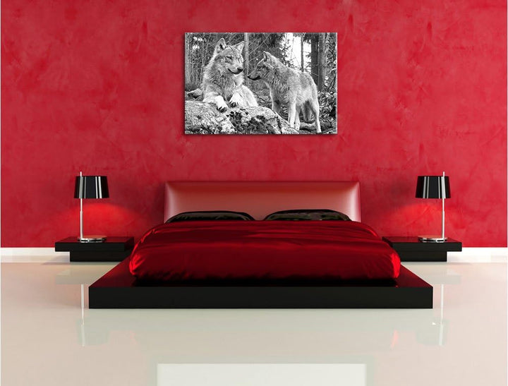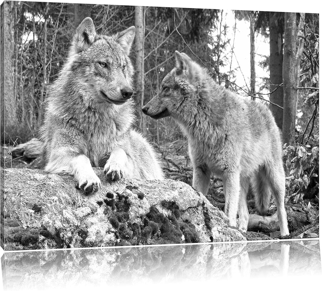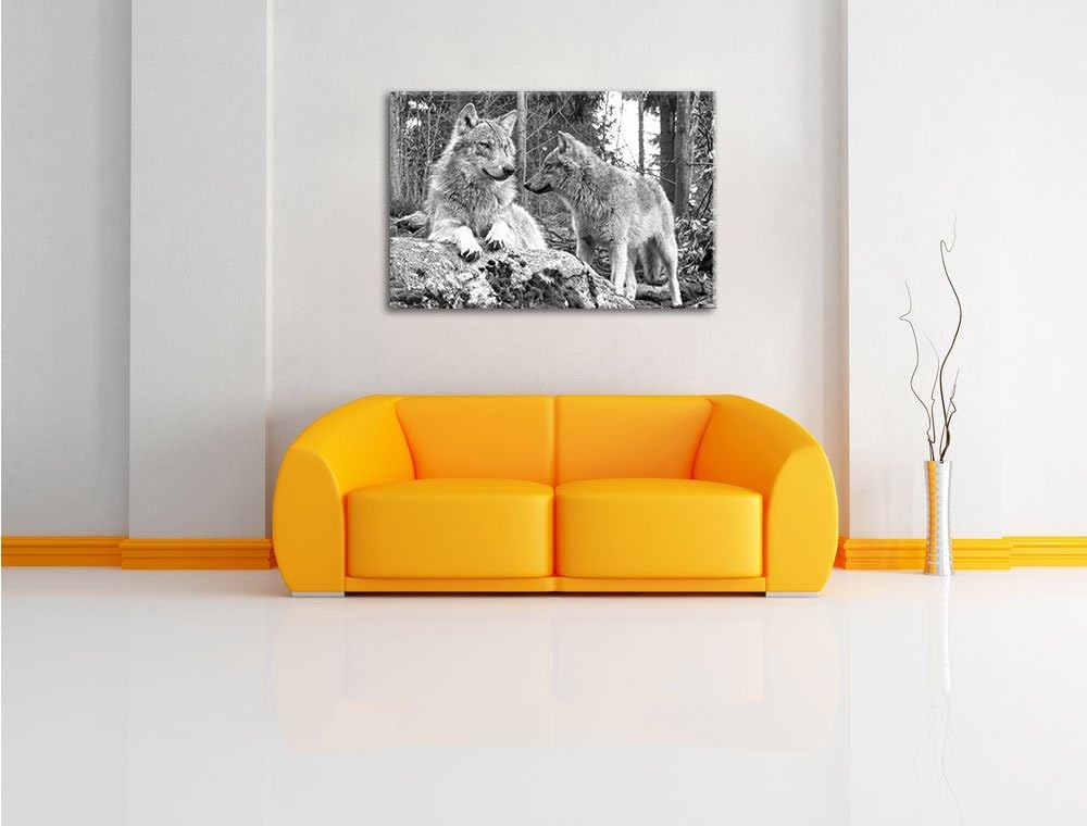 Wölfe im Wald Kunst B&W, Format: 100x70 auf Leinwand, XXL riesige Bilder fertig gerahmt mit Keilrahm