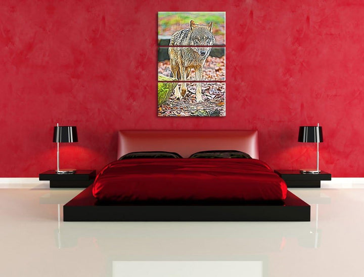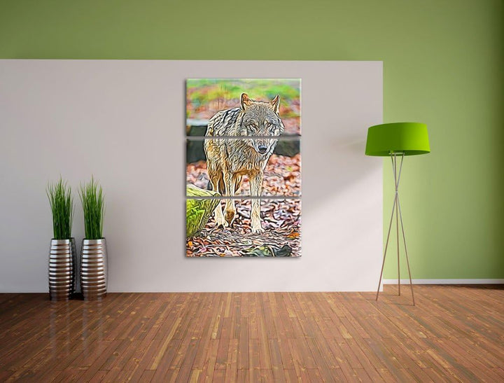 Wolf im Laubwald Spezial 3-Teiler Leinwandbild 120x80 Bild auf Leinwand, XXL riesige Bilder fertig g