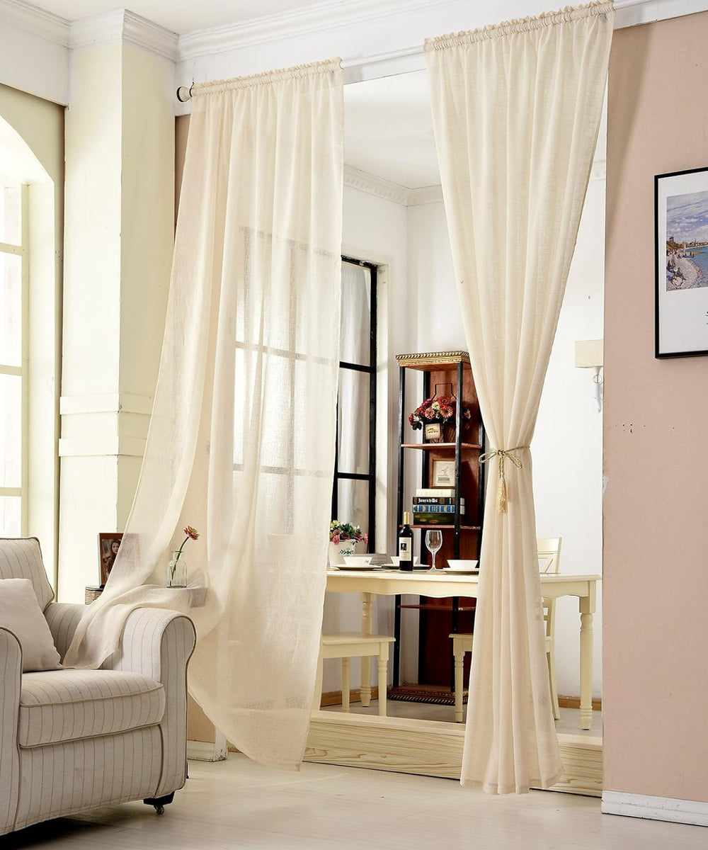 - GUTE LEINENIMITATION: Der Stoff aus 100 % Polyester mit Leinenoptik fällt gut und hat folgende Vorteile: langlebig, verschleissfest, verformungs- und ausbleichungsbeständig, leicht, lichtdurchlässig, atmungsaktiv und angenehm zu berühren