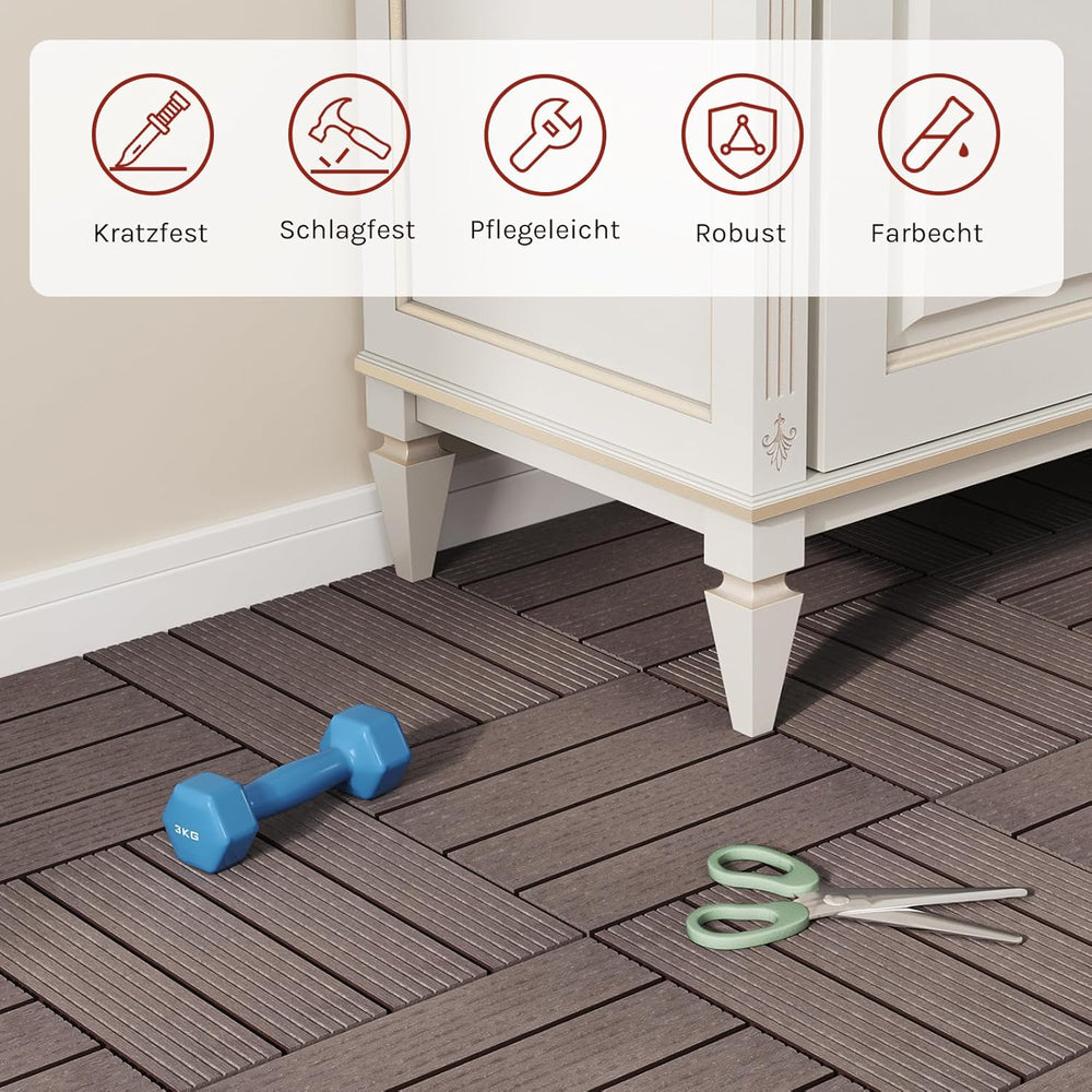 - Mehre Kombination: jede in 30x30cm und 11 Stücke, Die Fliesen können mit anderen Farben der Fliesen kombiniert werden. Ausserdem können die WPC Terrassenfliesen mit Stein-Klickfliesen oder Rasenfliessen kombiniert werden