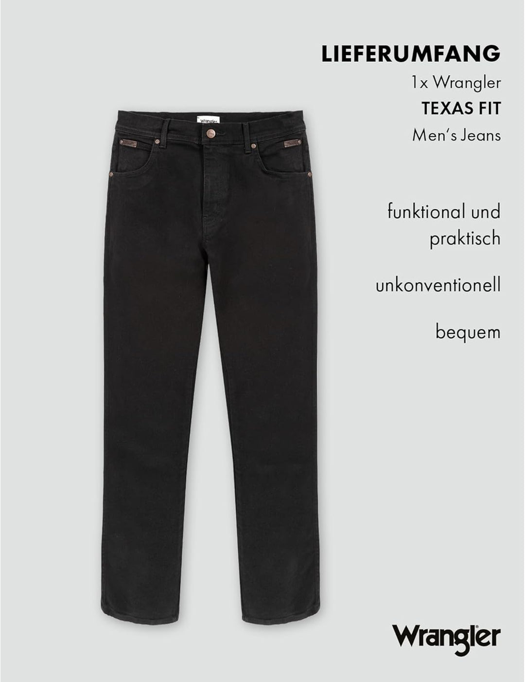 - Lieferumfang: 1x Wrangler-Herrenjeans, Modellnummer: 112126034, Länge: 36, Grösse: 34, Material: 99% Baumwolle 1% Elastan, Stretch: Wenig Stretch, Farbe: Black Overdye (Schwarz)