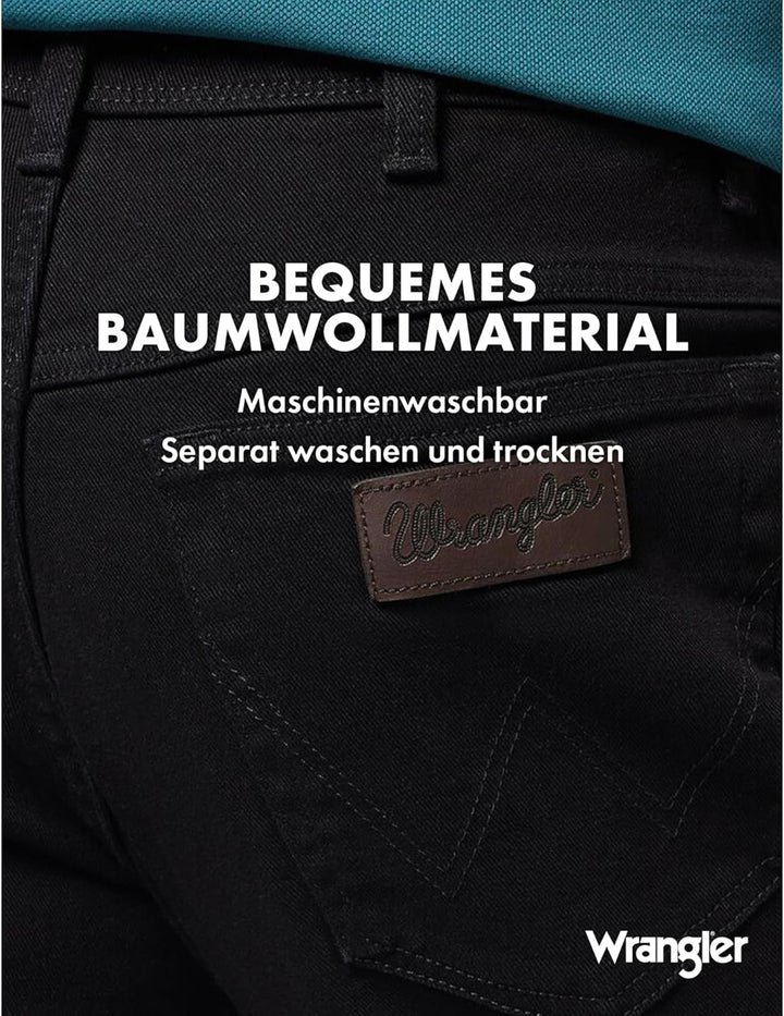 - Wrangler-Jeans für Männer aus Baumwolle: bequem zu tragen und als Kaltwäsche maschinenwaschbar, Auf links waschen und separat trocknen, um Abfärben zu vermeiden