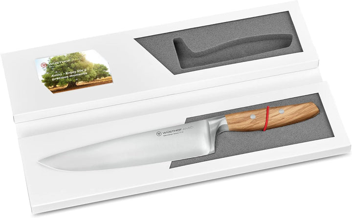- Jedes Amici Küchenmesser ist ein elegantes Original. Das liegt an der individuellen Maserung der ergonomischen Griffe aus nachhaltiger, kalabrischer Olive – ein langsam wachsender Baum, dessen Holz von Natur aus wasserabweisend und antibakteriell ist