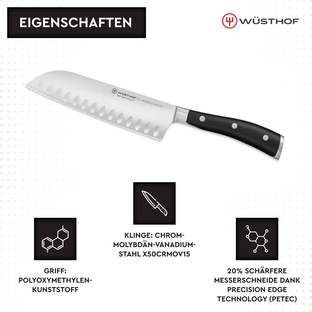- Als elegante Profi Kochmesser aus Solingen beeindrucken die Wüsthof Messer der Classic Ikon Serie selbst anspruchsvolle idealionisten. So ist auch dieses Messer als japanisches Kochmesser mit Kullenschliff ein scharfes Küchen Messer mit zeitlosem Design