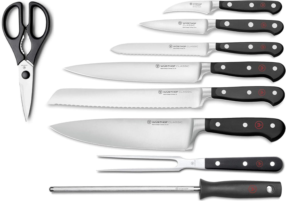 • Classic Messerset mit Profi-Messer Grundausstattung: Tourniermesser (mit 7 cm Klinge), Gemüsemesser (10 cm), Aufschnittmesser (14 cm), Schinkenmesser (20 cm), Brotmesser (23 cm), Kochmesser (20 cm), Fleischgabel (16 cm), Wetzstab (23 cm), Küchenschere