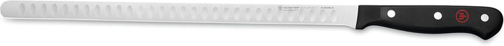 - Mit Gourmet hat Wüsthof Messer Basics im Angebot, die als scharfe Kochmesser nicht nur durch richtig gute Qualität und einen günstigen Preis begeistern, sondern als zuverlässige Solinger Messer – so wie dieses lange Spezialmesser für Lachs und Fisch