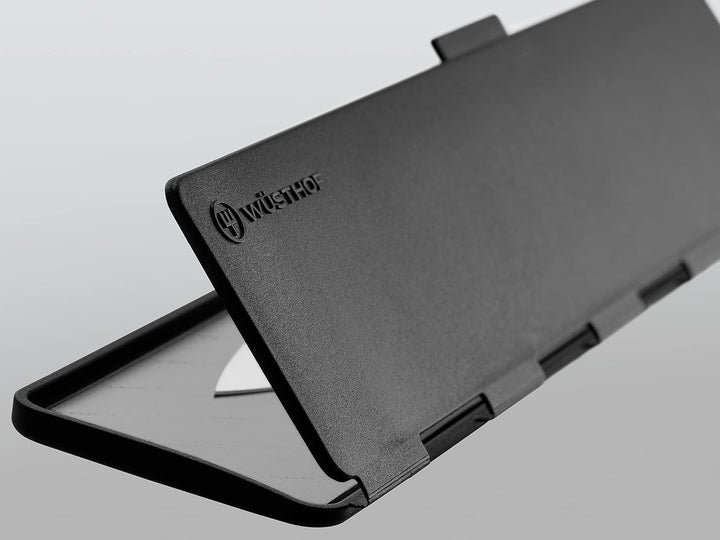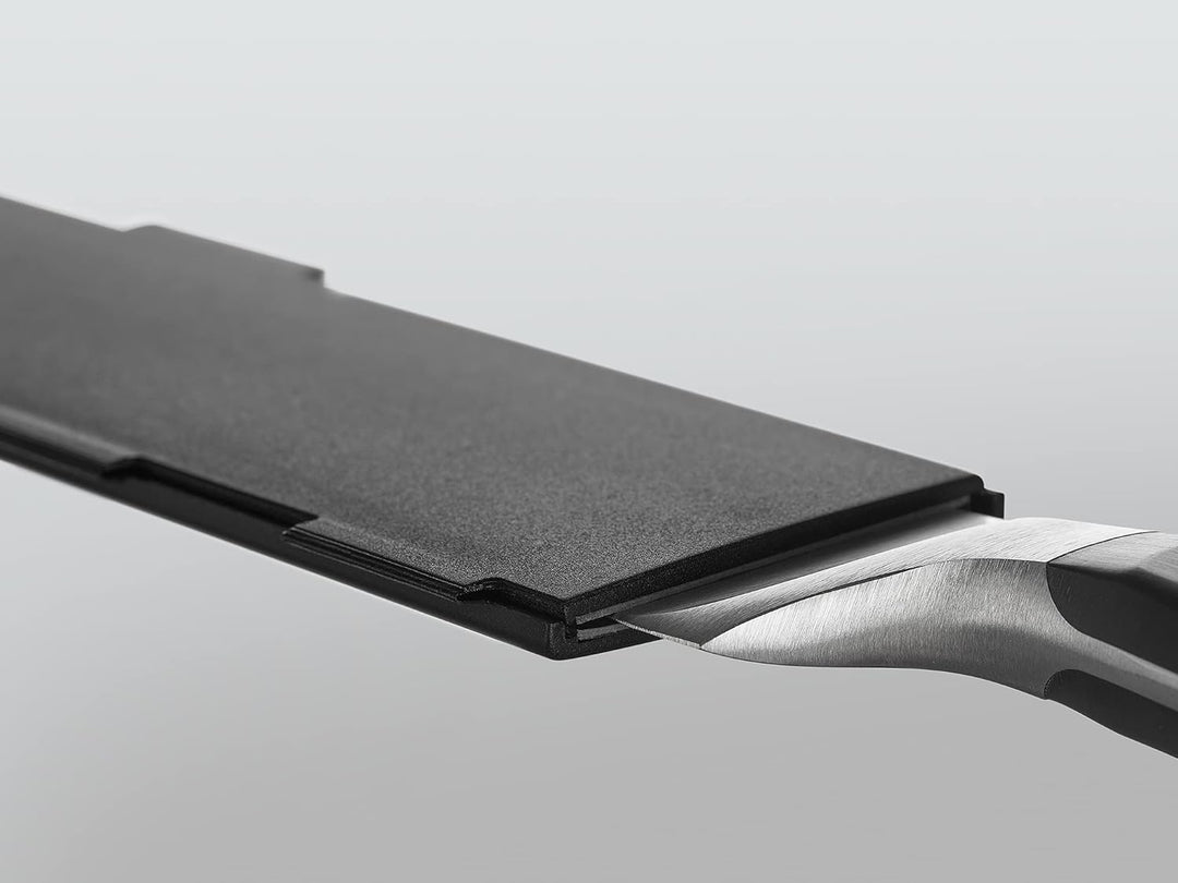 - Magnetisch & pflegleicht: Das seitliche Klappscharnier ermöglicht ein sicheres Öffnen und Schliessen des Messerschützers – die Klinge haftet beim Einlegen automatisch an. Der schwarze Kunststoff lässt sich mit einem feuchten Tuch leicht reinigen