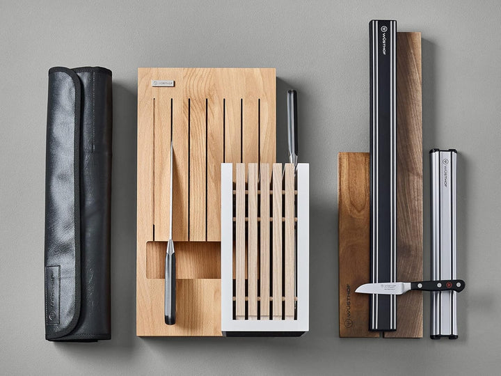 • Auch aus Aluminium (30cm breit), hellerem Akazien-Holz oder dunklerem Walnuss-Holz (je 30 cm o. 50 cm) erhältlich. Weitere Storage-Lösungen (Messerblock, Messereinsatz für Schubladen, Rolltasche, Klingenschützer) finden sie im grossen Wüsthof