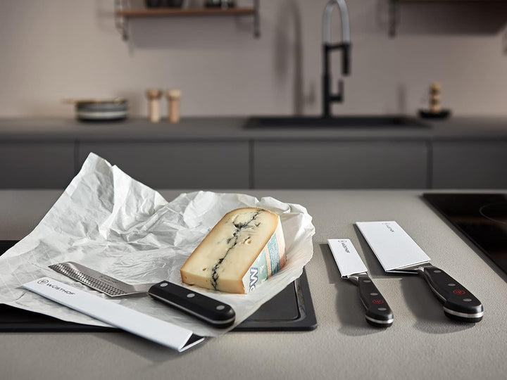 - Agil und spülmaschinengeeignet – der ergonomische Griff ist 3-fach vernietet und absolut hygienisch und pflegeleicht. Der Griff des Küchen-Werkzeuges bietet den Fingern viel Platz, um harten Käse kraftvoll und sicher zu schneiden