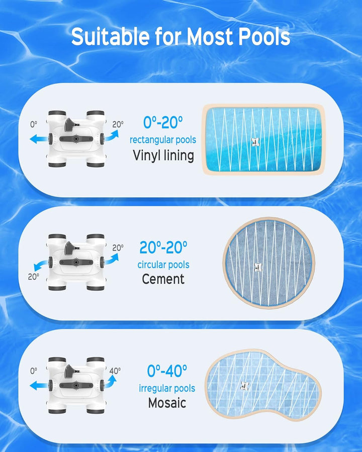 - 【Kompatible Pooltypen】Durch die Einstellung des Austrittswinkels kann der Poolroboter alle Arten von Pools abdecken, egal ob es sich um einen oberirdischen Pool (bis zu 30° Neigung), einen unterirdischen Pool, einen runden Pool, einen ovalen Pool