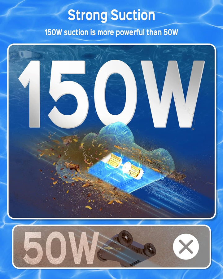 - 【Effektive Reinigung:】Der Poolroboter verfügt über leistungsstarke 150W Zwei Motoren, 2 grosse wassereinlässe und einen 180μm feinfilter. Im Vergleich zu kabellosen modellen mit nur 50 W kann er mühelos grosse Blätter und zweige aufsaugen und