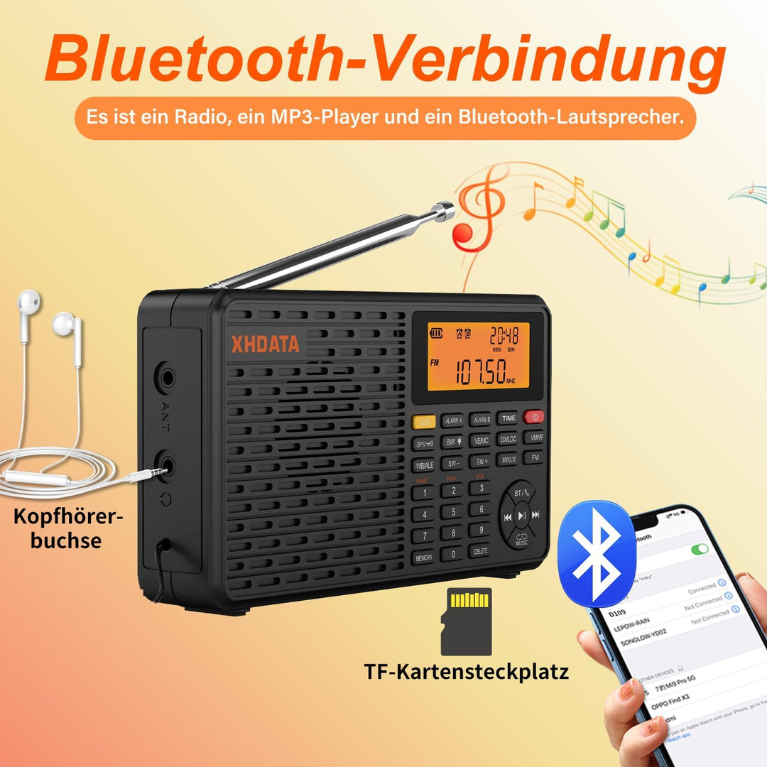 - VOLL AUSGESTATTET: XHDATA D109WB Kofferradio hat V5.0 Bluetooth und Micro SD-Kartenslot (Micro SD nicht enthalten, maximale Unterstützung 32G), eingebauter 5W Hochleistungslautsprecher mit 3.5mm Kopfhörerbuchse; doppelte Weckfunktion; LCD-Display zeigt