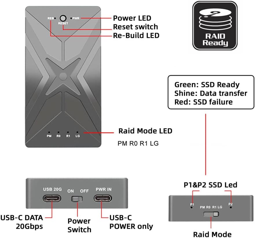 - Dual NVME M.2 NGFF M-Key zu USB-C Typ-C Raid0 Raid1 JOBD Big Enclosure 20Gbps mit Lüfter Raid0 Hyper Adapter