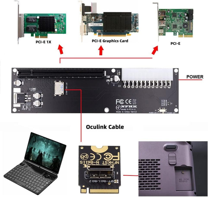 - Lieferumfang: 1 x OCuLink SFF-8612 Buchse auf Key M Stecker Adapter, 1 x Oculink SFF-8611 Kabel, 1 x OCuLink SFF-8612 Buchse auf PCI-E 16 x Adapter