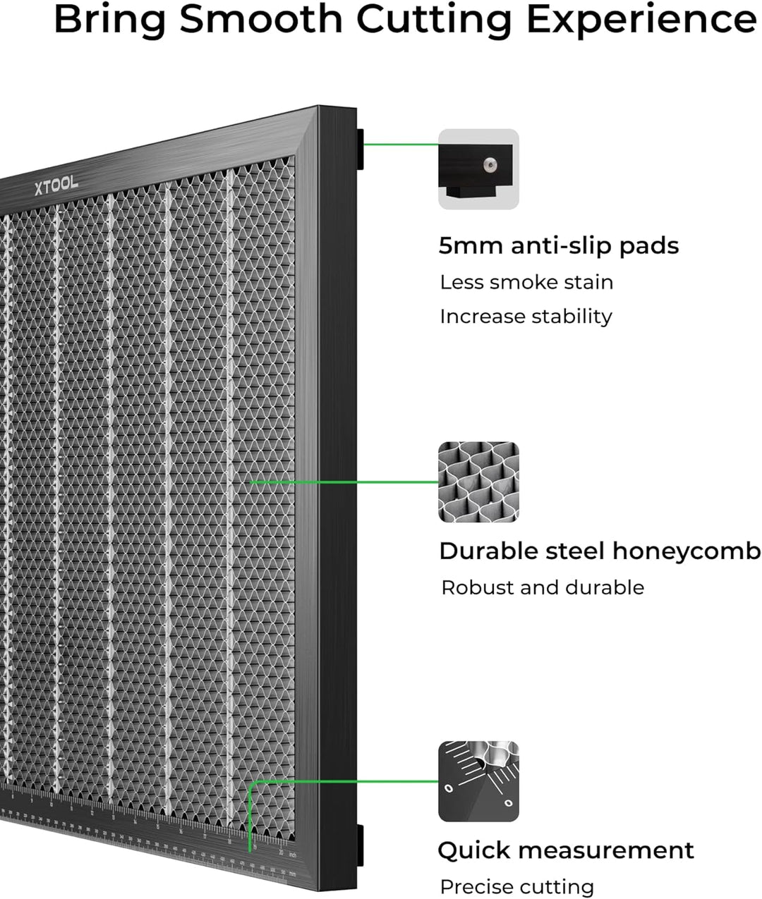 • xTool Waben Arbeitstisch ist aus Eisen und Aluminium, so dass sie stabiler, langlebig und rostbeständig. Flach und glatt mit einheitlichen Wabenlöchern Design beschleunigt den Rauch, löst das Problem von Holz und anderen Materialien Schwärzung durch
