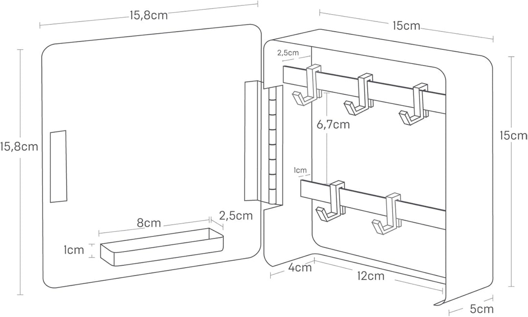 - Funktional: Dieser magnetische Schrank hat zwei Innenstege, die es ermöglichen, dass Schlüssel so nah oder so weit wie nötig an den Haken platziert werden können. An der Innentür befindet sich auch eine kleine Ablagefläche. Das leichte Design des