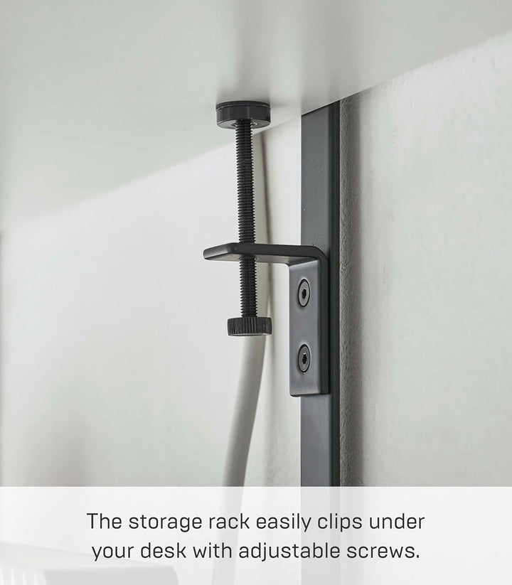 - Einfache Installation: Das Aufbewahrungsregal lässt sich einfach unter Ihrem Schreibtisch klemmen, mit verstellbaren Schrauben, die gegen die Unterseite Ihres Schreibtisches gedrückt werden.
