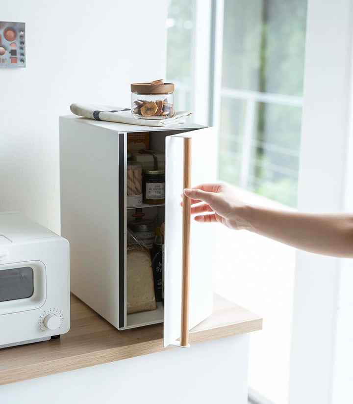- Der aus Stahl gefertigte Kasten ist mit einer magnetischen Tür und einem schönen Holzgriff ausgestattet, der dem Raum einen Hauch von Wärme verleiht.