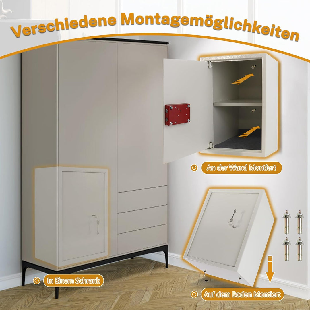 - 🏢 Flexible Nutzung: Dieser Tresor ist äusserst vielseitig und eignet sich perfekt für den Einsatz im Heim- oder Büroumfeld sowie in verschiedenen Geschäftsumgebungen. Sie können ihn flexibel am Boden oder an der Wand montieren.