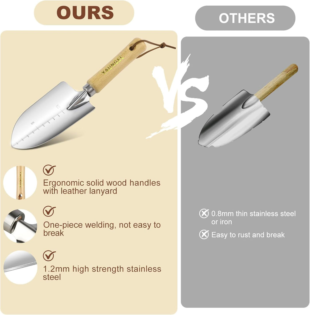 - Komfortabler Griff - Der gut gestaltete Griff aus Eschenholz liegt gut in der Hand und reduziert Handschmerzen und Ermüdung beim Graben, Jäten und Pflanzen. Die Unterseite des Griffs ist mit einem Kuhfellband versehen, um die Aufbewahrung zu