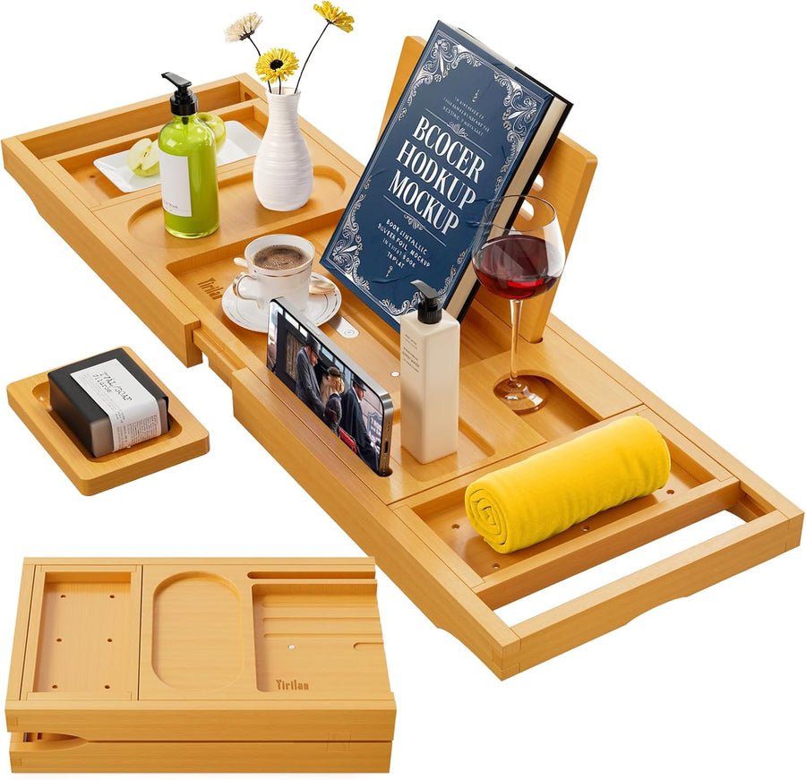 - Multifunktionales Badezimmertablett: Das Badezimmertablett von Yirilan hat mehrere funktionale Positionen wie Weingläser, Kerzen, Mobiltelefone und Toilettenartikel. Die Buchstützen können iPads, Tablets und Bücher halten, um Ihren verschiedenen