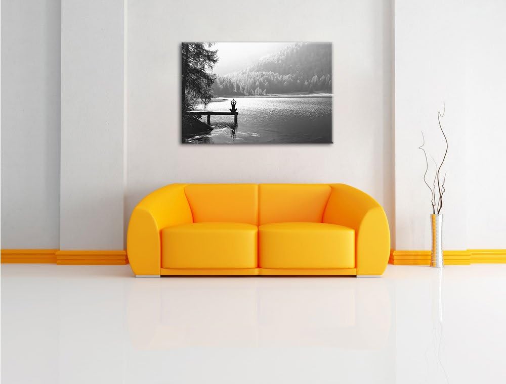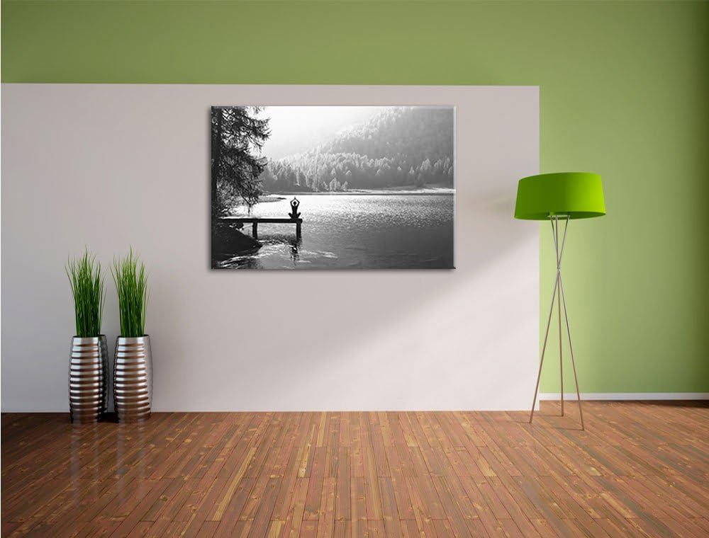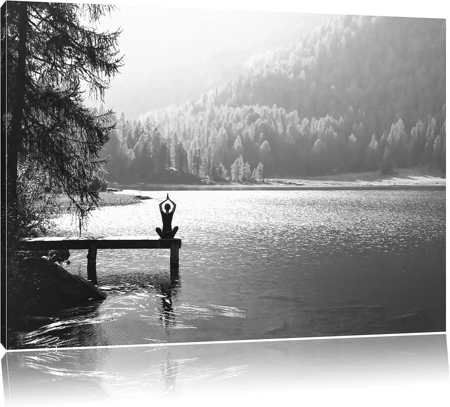 Yoga am See Kunst B&W, Format: 100x70 auf Leinwand, XXL riesige Bilder fertig gerahmt mit Keilrahmen
