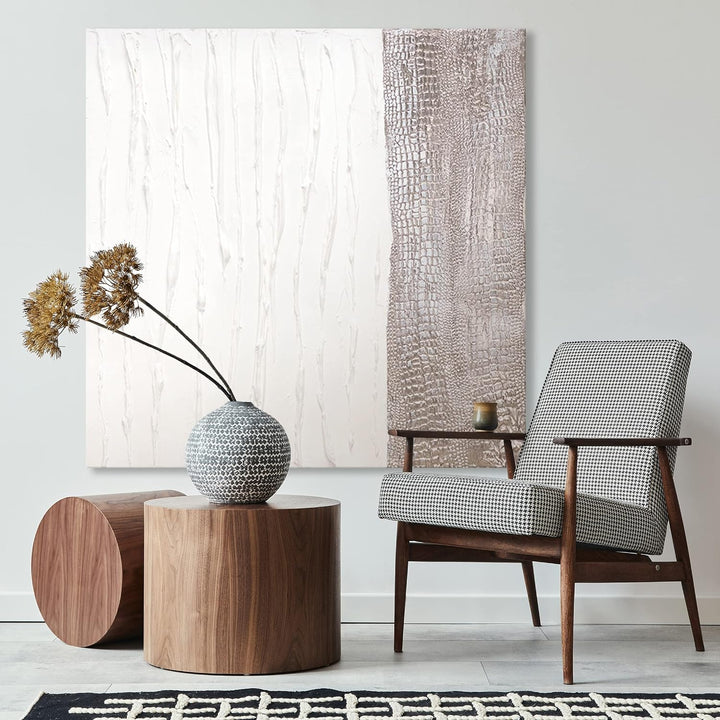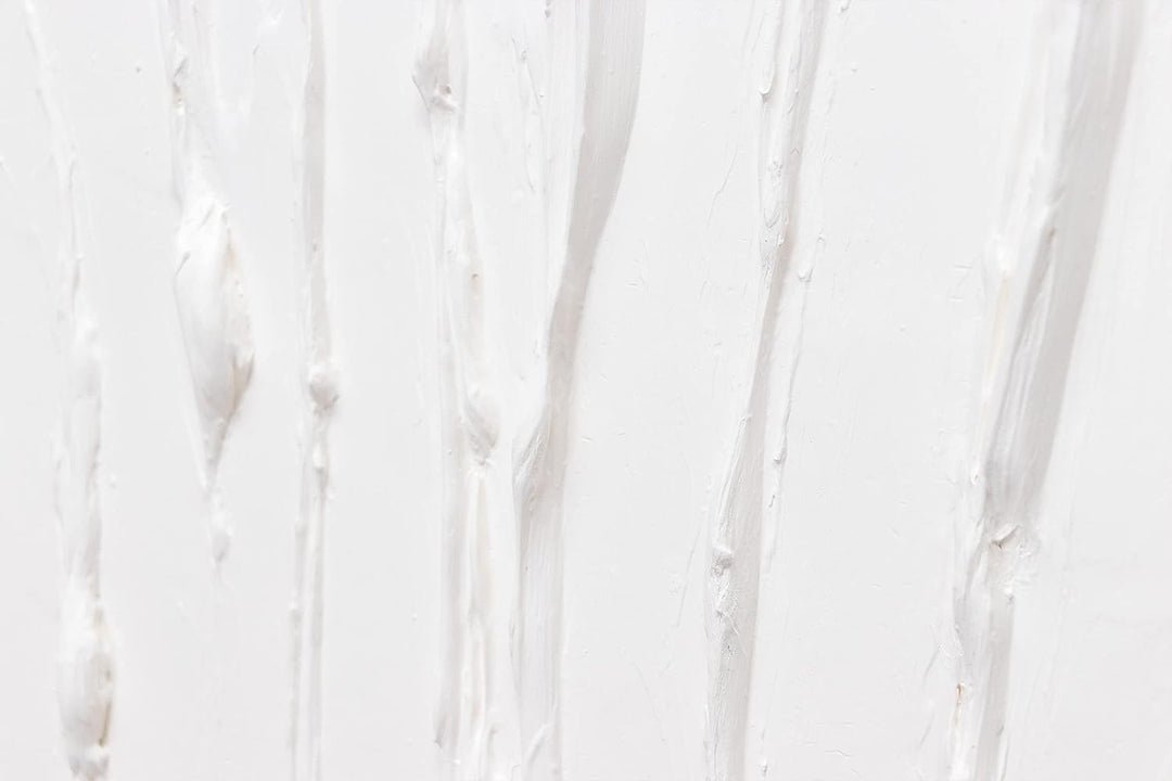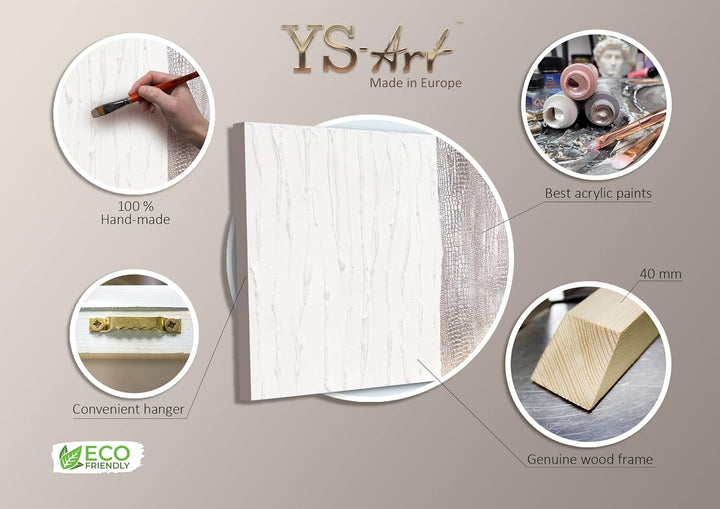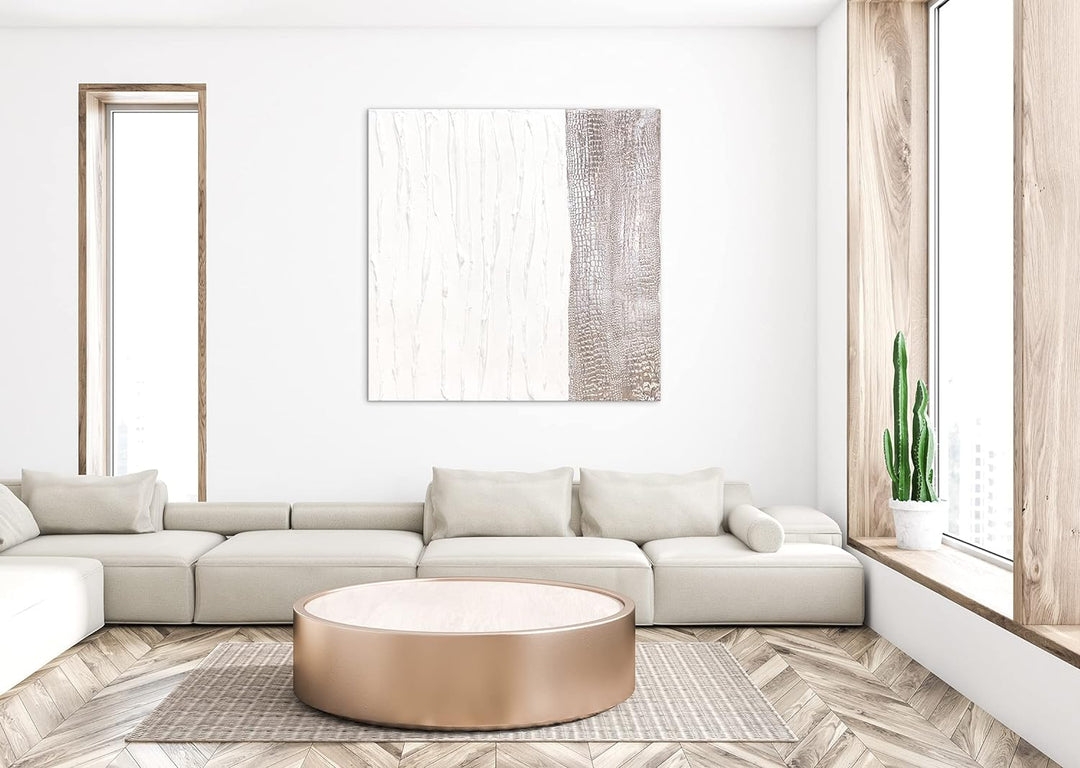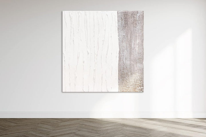 - Handgemaltes Gemälde der exklusiven Serie Trend in der Grösse 100 × 100 cm "Lebensfroh IV". Das Gemälde wurde mit weisser Farbe gemalt und mit Blattgold veredelt.