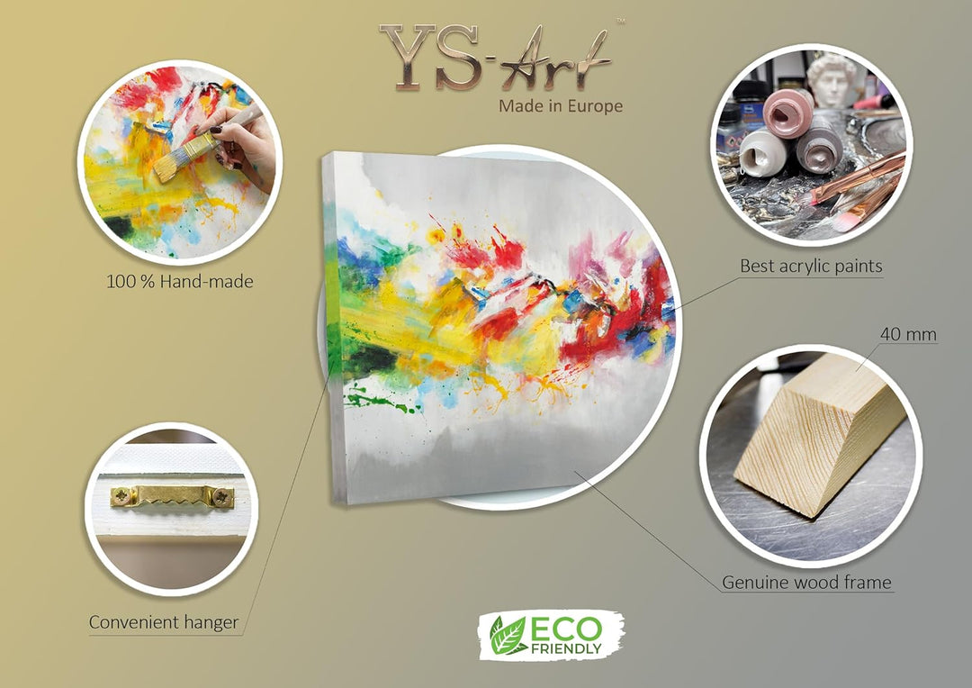• Jedes Acrylgemälde auf Leinwand aus unserer YS Art Premium Serie wird vom Künstler signiert und ein Echtheitszertifikat wird beigelegt. Bei uns wird noch alles noch per Hand gemacht. Vom Anfertigen eines Keilrahmens, über das Spannen der hochwertigen