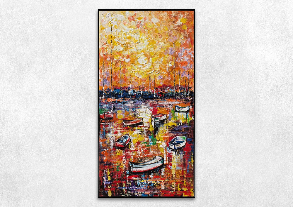 • Ein helles Gemälde mit Herbstmotiven erfüllt Ihr Interieur zu jeder Jahreszeit mit Wärme und Komfort. Das Motiv eines ruhigen Yachthafens, die in diesem Gemälde so realistisch dargestellt wird, wird Sie abends nach einem anstrengenden Arbeitstag zur