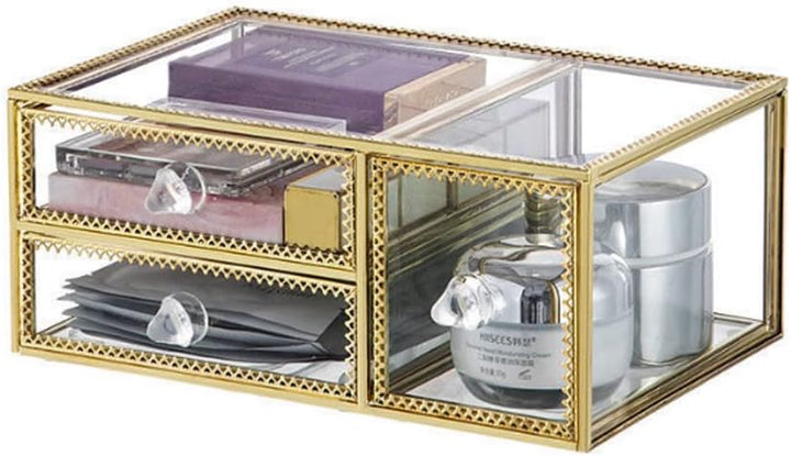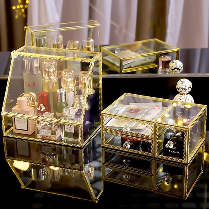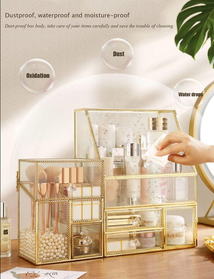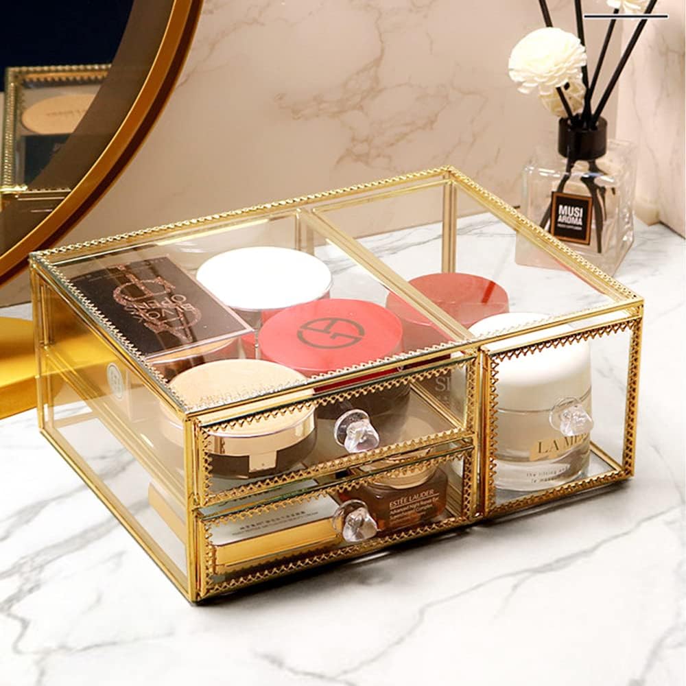 - Machen Sie Ihr Leben einfacher: Dieser goldene Make-up-Organizer im eleganten Design hilft Ihnen dabei, Unordnung auf der Arbeitsplatte zu reduzieren, Platz zu sparen und Ordnung zu halten. Es kann auf Ihrer Arbeitsplatte oder Kommode platziert werden,