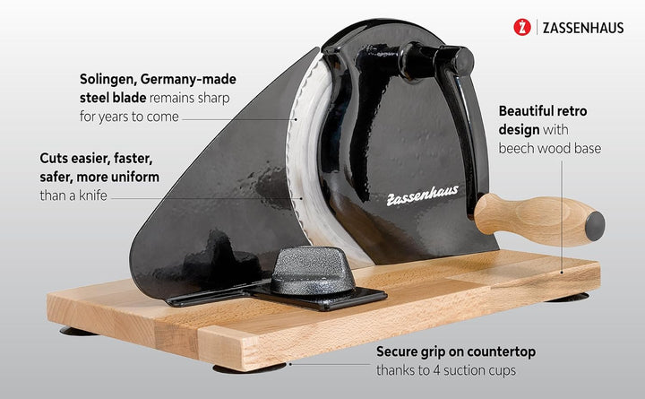 - SICHERHEIT: Anders als bei einer elektrischen Brotschneidemaschine, entscheiden Sie bei der Zassenhaus CLASSIC mithilfe der Handkurbel selbst über die Schnittgeschwindigkeit schützen somit ihre Hände vor dem Schneideblatt.