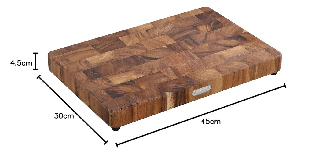 - Gefertigt wurde der Hackblock aus nachhaltigem Akazienholz-Stirnholz in der Farbe Dunkelbraun
