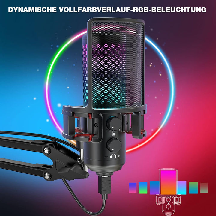 - 【Strahlendes RGB-Licht mit dynamischen Effekten】Personalisieren Sie atemberaubendes RGB-Licht und dynamische Effekte für eine auffällige Aufnahme mit anpassbarem Stil. Schliessen Sie dieses RGB-Kondensator USB Mikrofon an, um Videos zu erstellen
