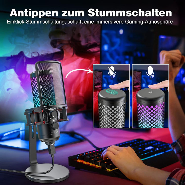 - 【Tap-to-Mute mit LED-Statusanzeige】Verwenden Sie die praktische Tap-to-Mute-Funktion auf der Oberseite des Mikrofons, um mit Hilfe der LED-Mikrofonstatusanzeige unangenehme Unfälle beim Senden zu vermeiden. Schalten Sie das Mikrofon mit einem