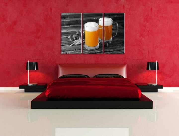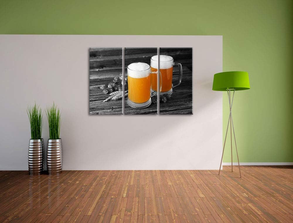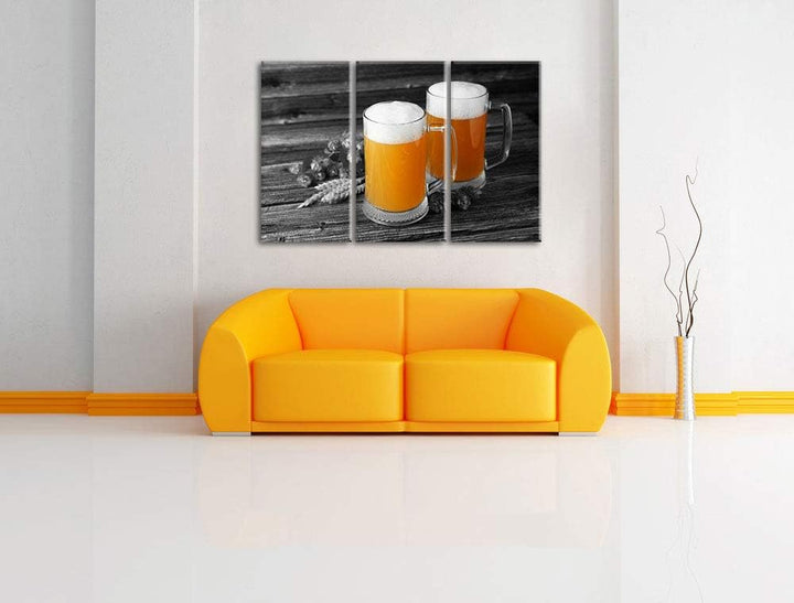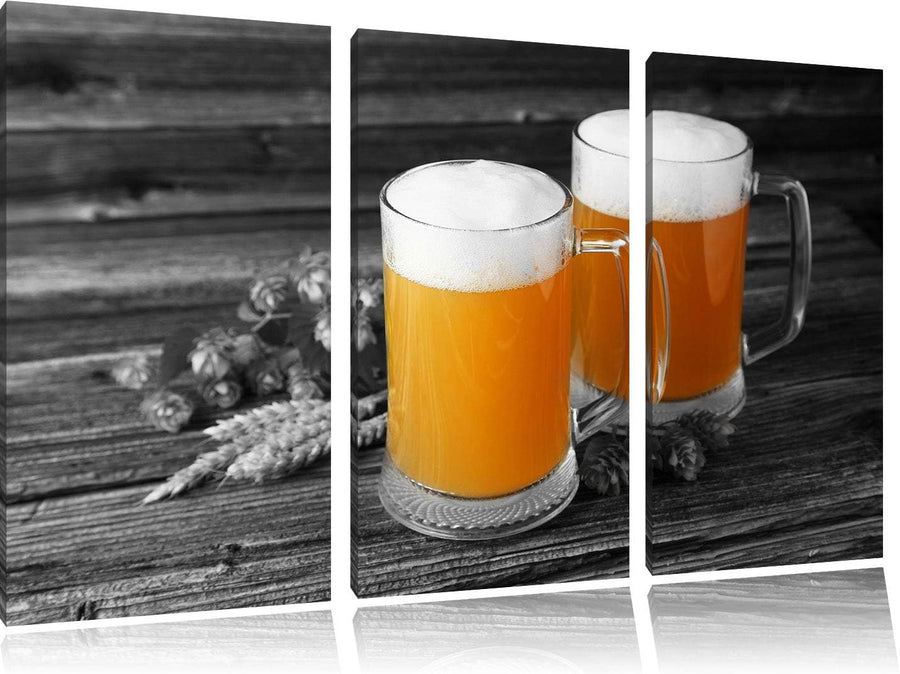 Zwei Biergläser Hefeweizen mit Hopfen auf Holztisch schwarz/weiss 3-Teiler Leinwandbild 120x80 Bild