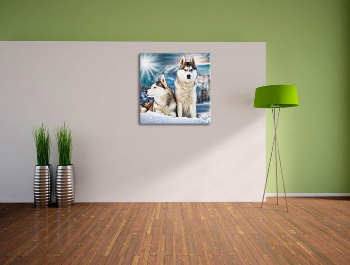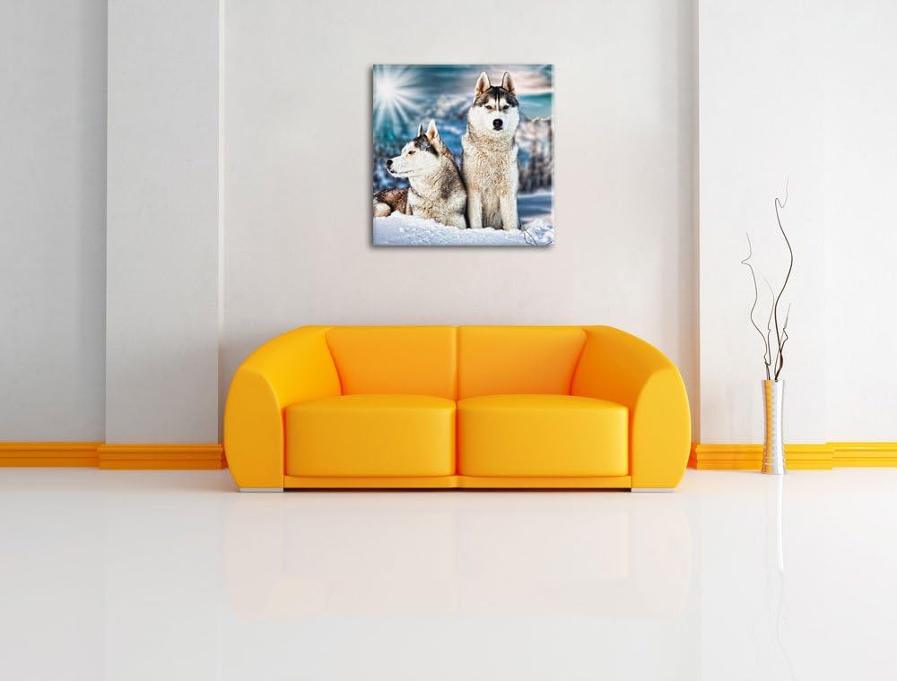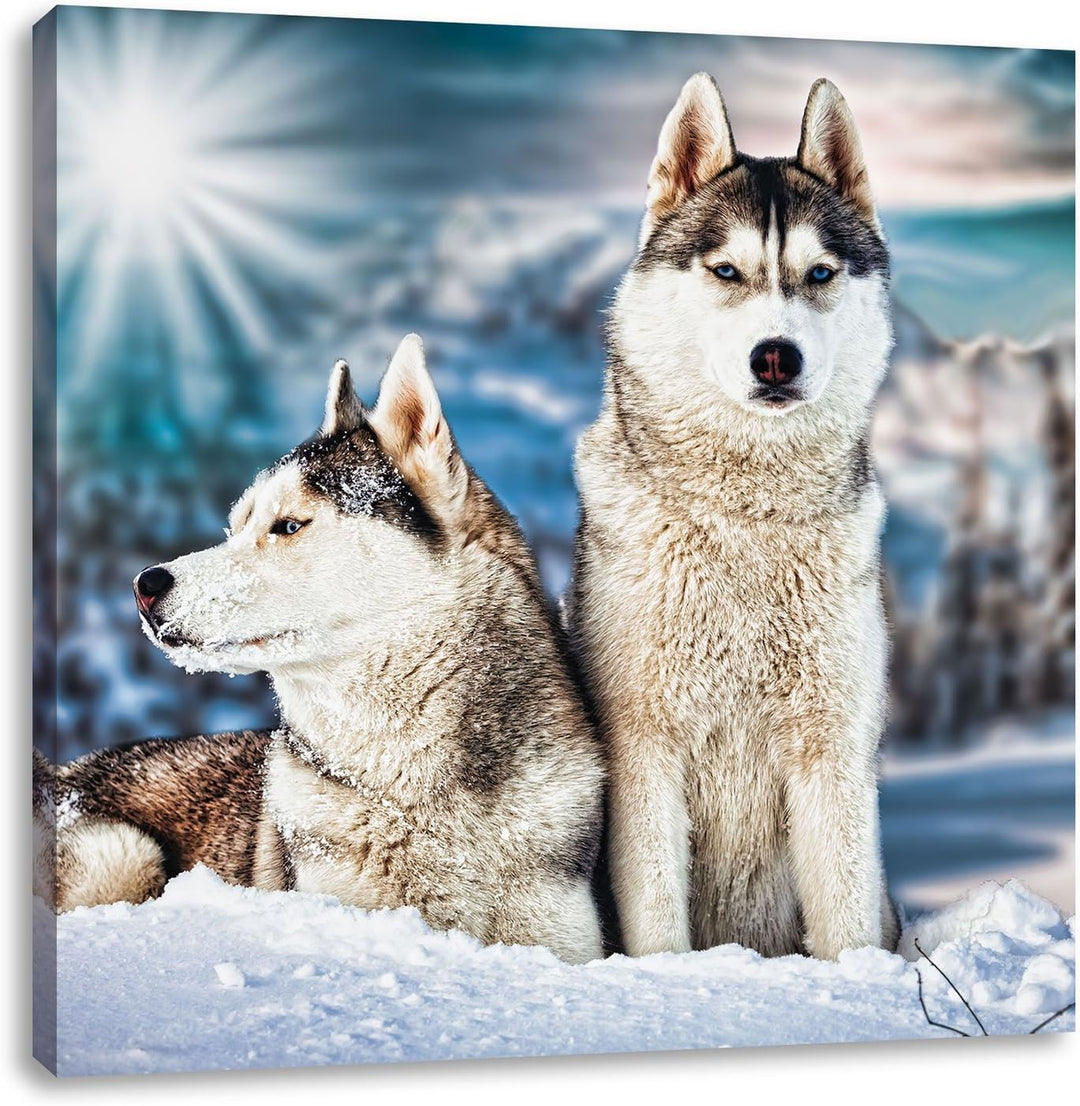 Zwei wilde Huskies, Format: 70x70 auf Leinwand, XXL riesige Bilder fertig gerahmt mit Keilrahmen, Ku