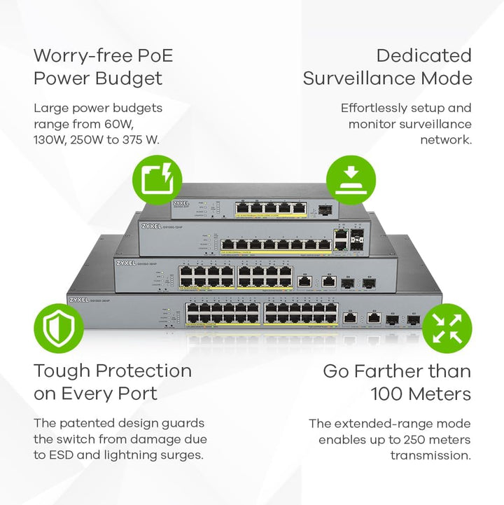 - Bietet PoE+ 30-Watt (802.3at) auf allen Ports mit einem grossen PoE-Budget von insgesamt 250 W.