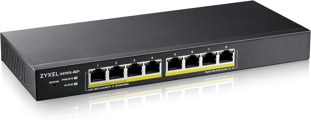 - Alle acht Ports unterstützen 802.3at PoE+ mit einer Gesamtleistung von 60 W.