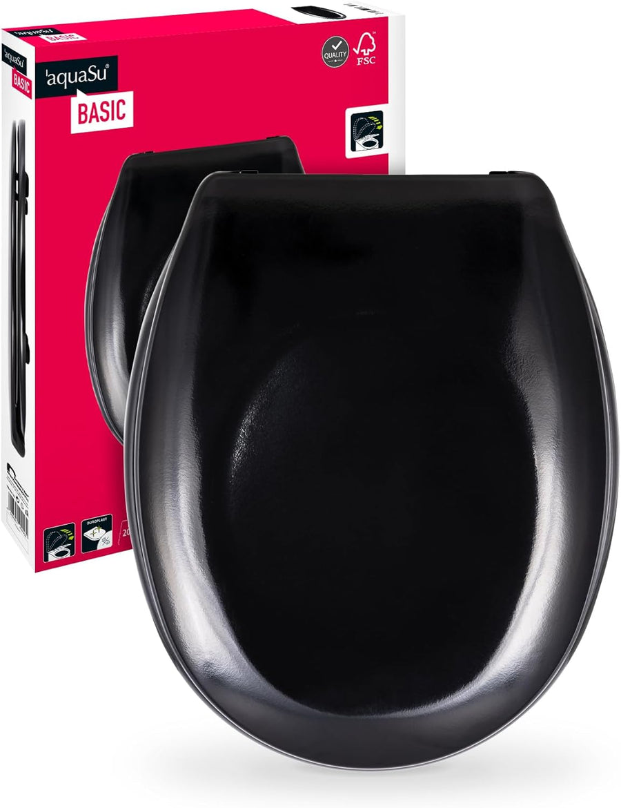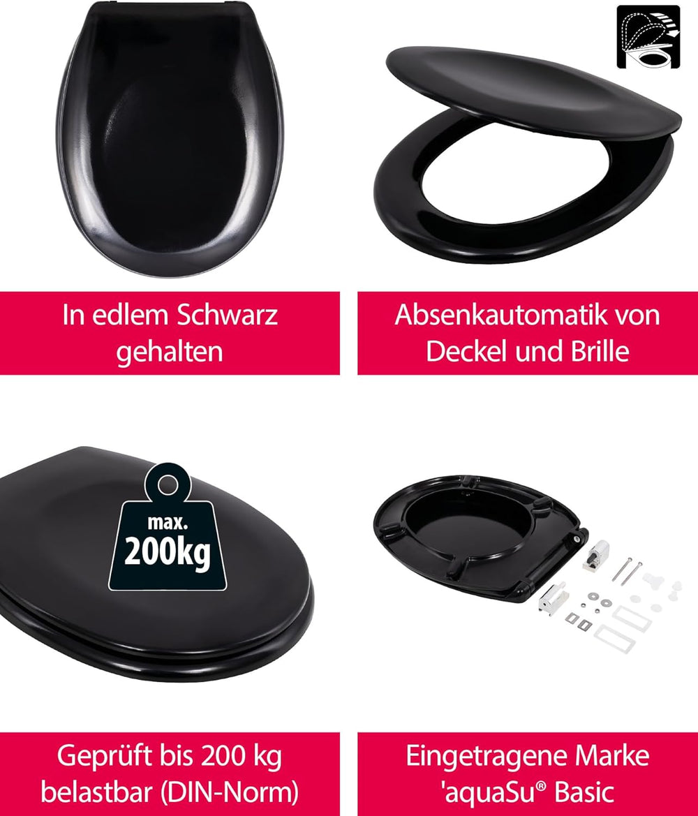 'aquaSu® Basic, WC-Sitz in Schwarz, Duroplast Toilettendeckel mit Absenkautomatik, Belastbar bis 200