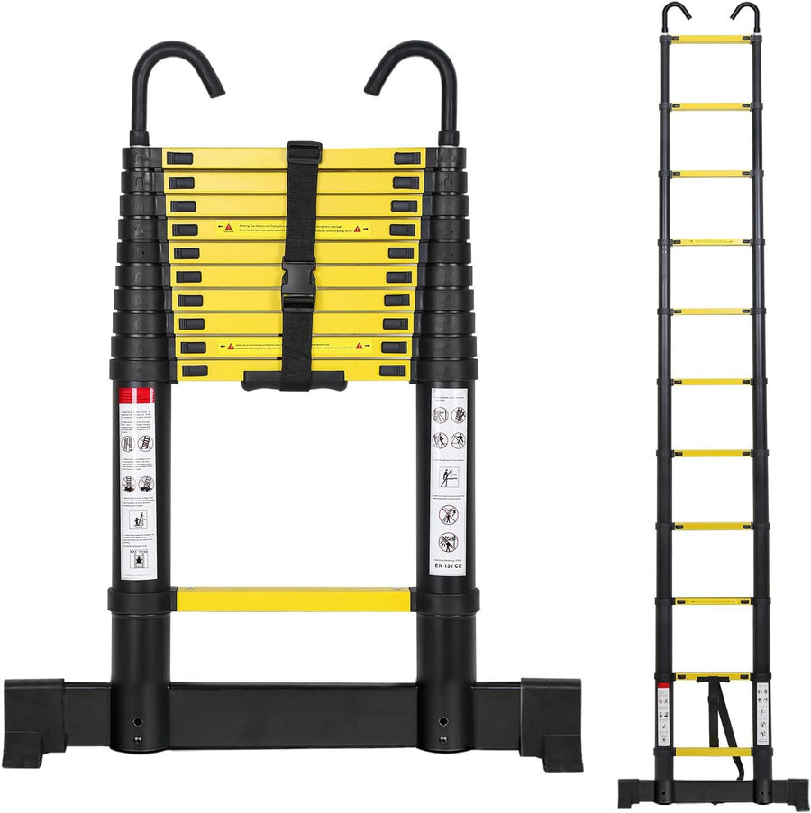 Aluminium Teleskopleiter 3.2M, Ausziehbare Leiter mit Stabilisator und Abnehmbaren Haken, Rutschfest