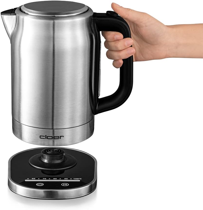 Cloer 4459 Touch-Wasserkocher, Basisstation mit Glasoberfläche-LED-Anzeige, 1,7 Liter, Edelstahl Tou