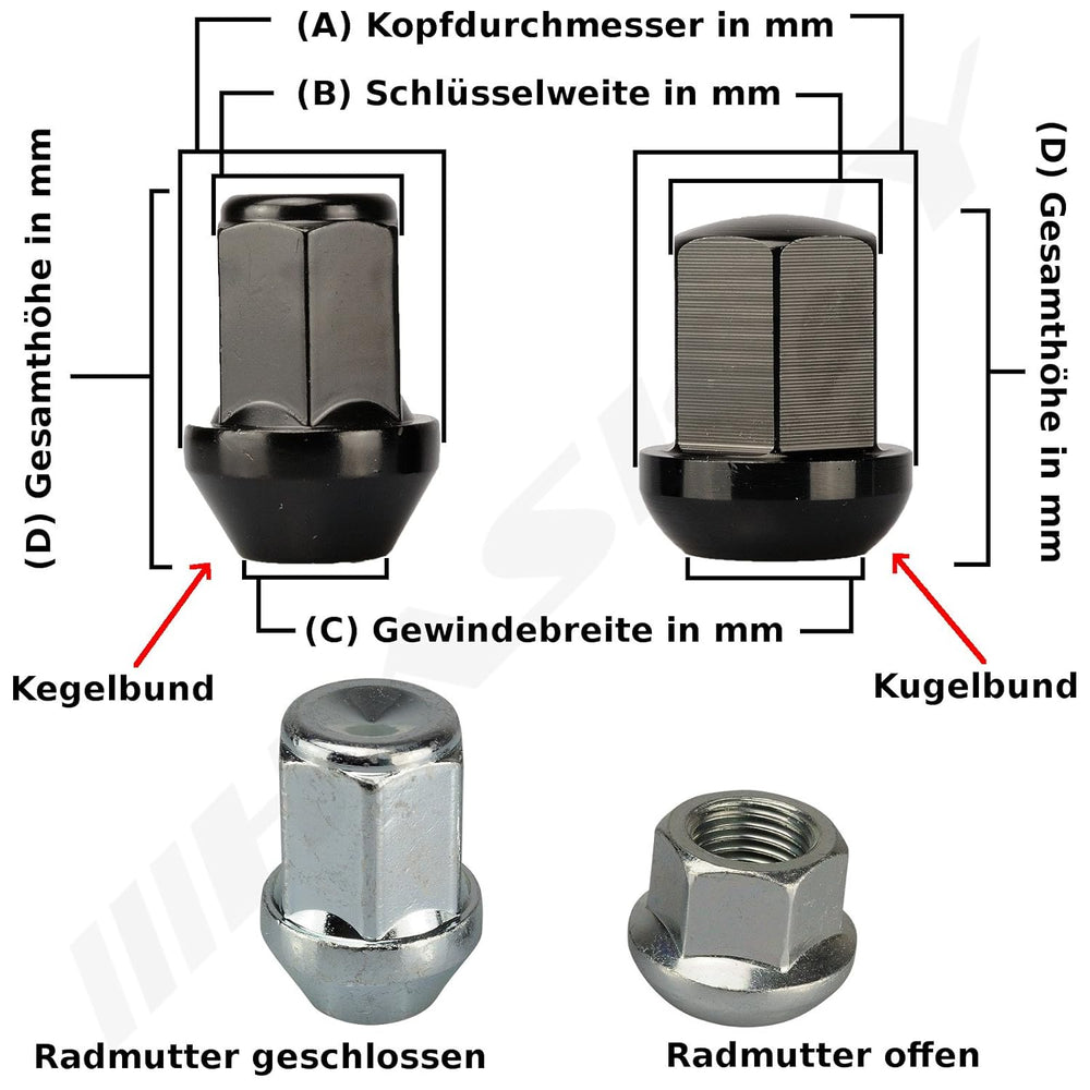 20 Radmuttern Rad Muttern SCHWARZ M12x1,5 Schaftlänge: 34mm Kegel 60° Kegelbund SW19
