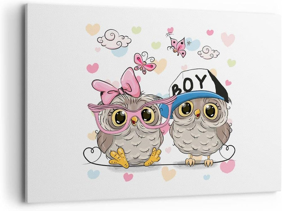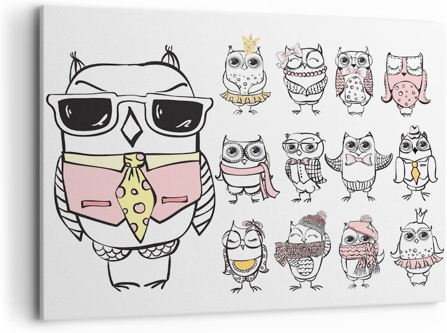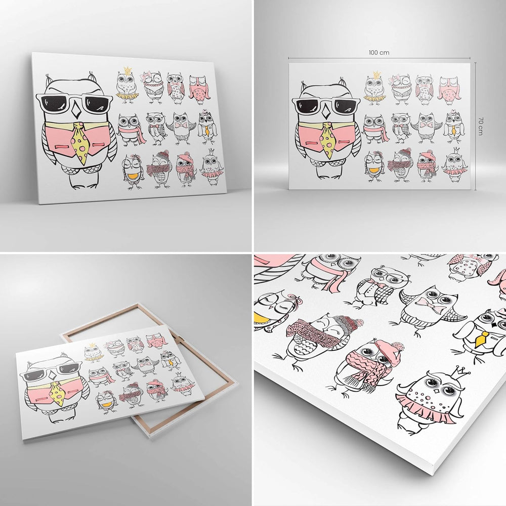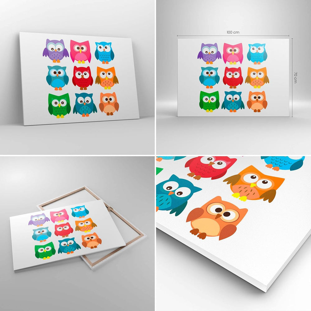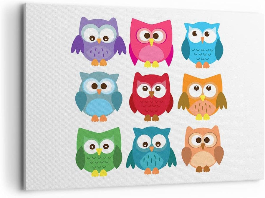 Bilder auf Leinwand 100x70cm Leinwandbild Eulen Bunt Kinder Zeichnung Gross Wanddeko Bild Schlafzimm