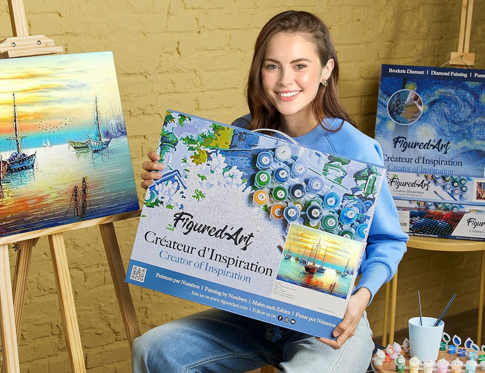 Figured'Art Malen Nach Zahlen Erwachsene Mit Rahmen Segelboote an der Küste - Paint by Numbers Baste