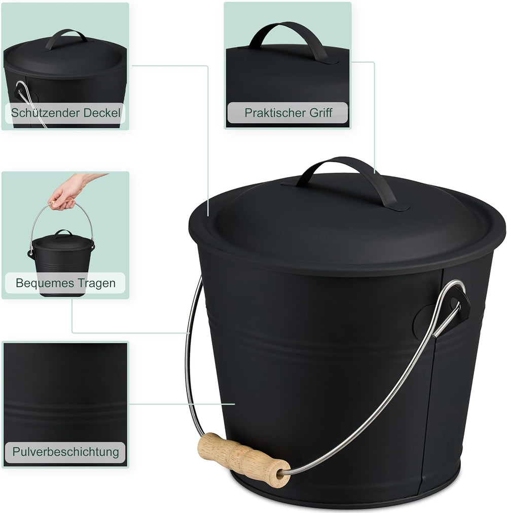 Relaxdays Ascheeimer mit Deckel, 12 l, Aschetonne mit Henkel, für Kohle & Asche, Kamin, Ofen, verzin