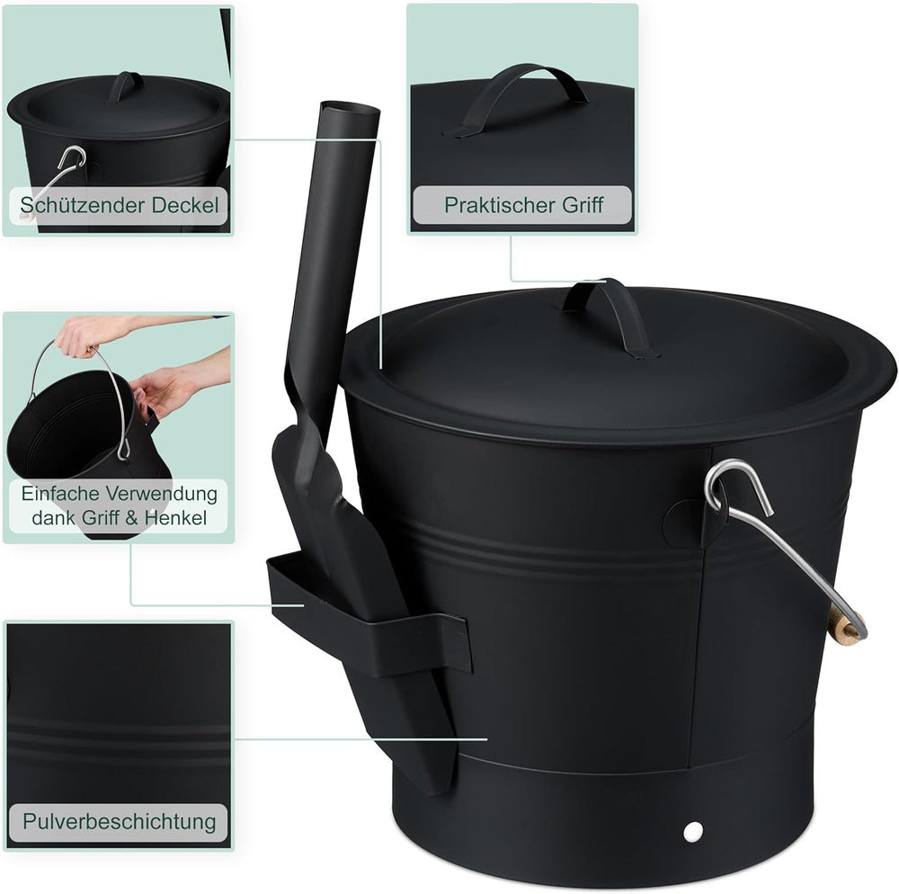 Relaxdays Ascheeimer mit Deckel und Kehrset, 19 L, inkl. Aschebesen & Kaminschaufel, Aschebehälter m