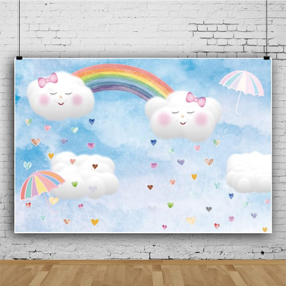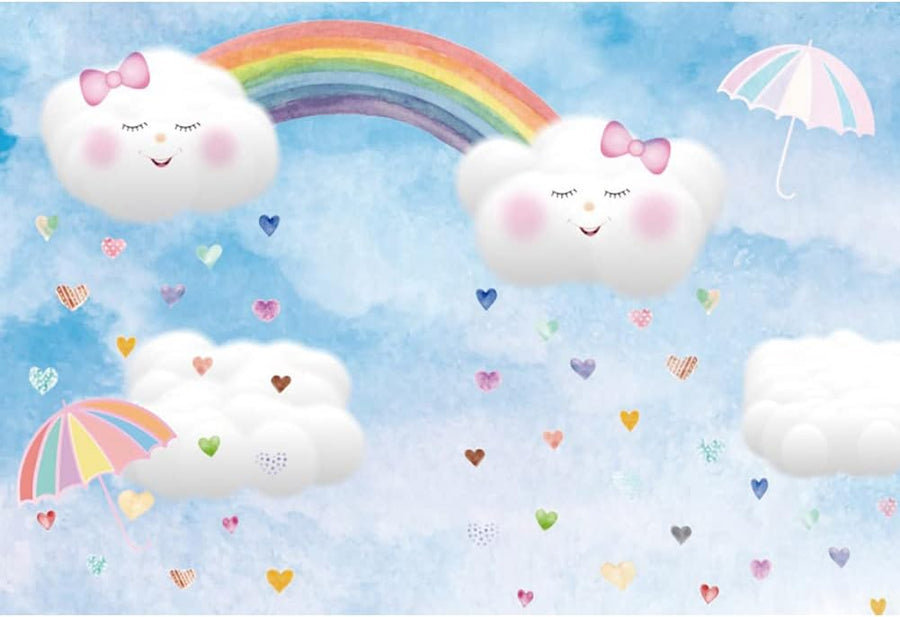 Renaiss 3x2m Cartoon Baby Shower Hintergrund Blauer Himmel Weisse Wolke Regenbogen Regenschirm Liebe